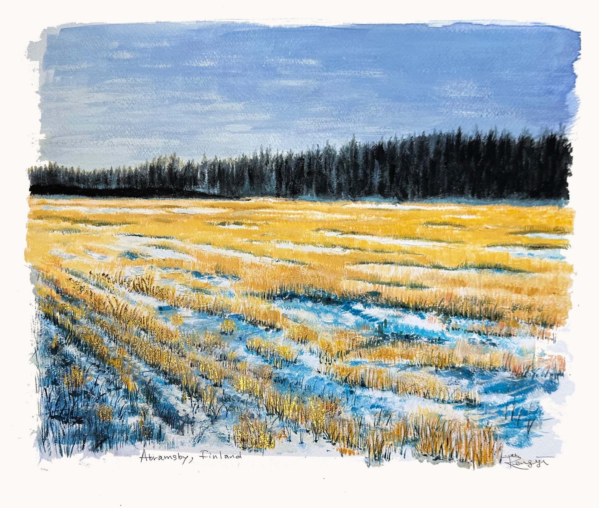 The winter scenery of Finland is quiet and beautiful.    F8 size acrylic painting with gold leaf