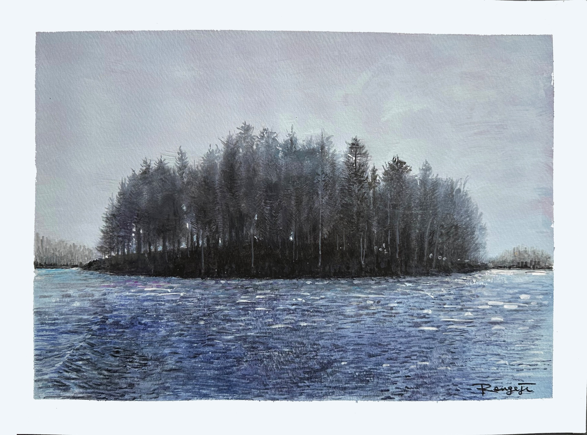 フィンランドには1万年前の氷河期による島が17万8千以上あると言われる。島には木苺やキノコが生え、自由に採ることができる。 F4号 水彩画