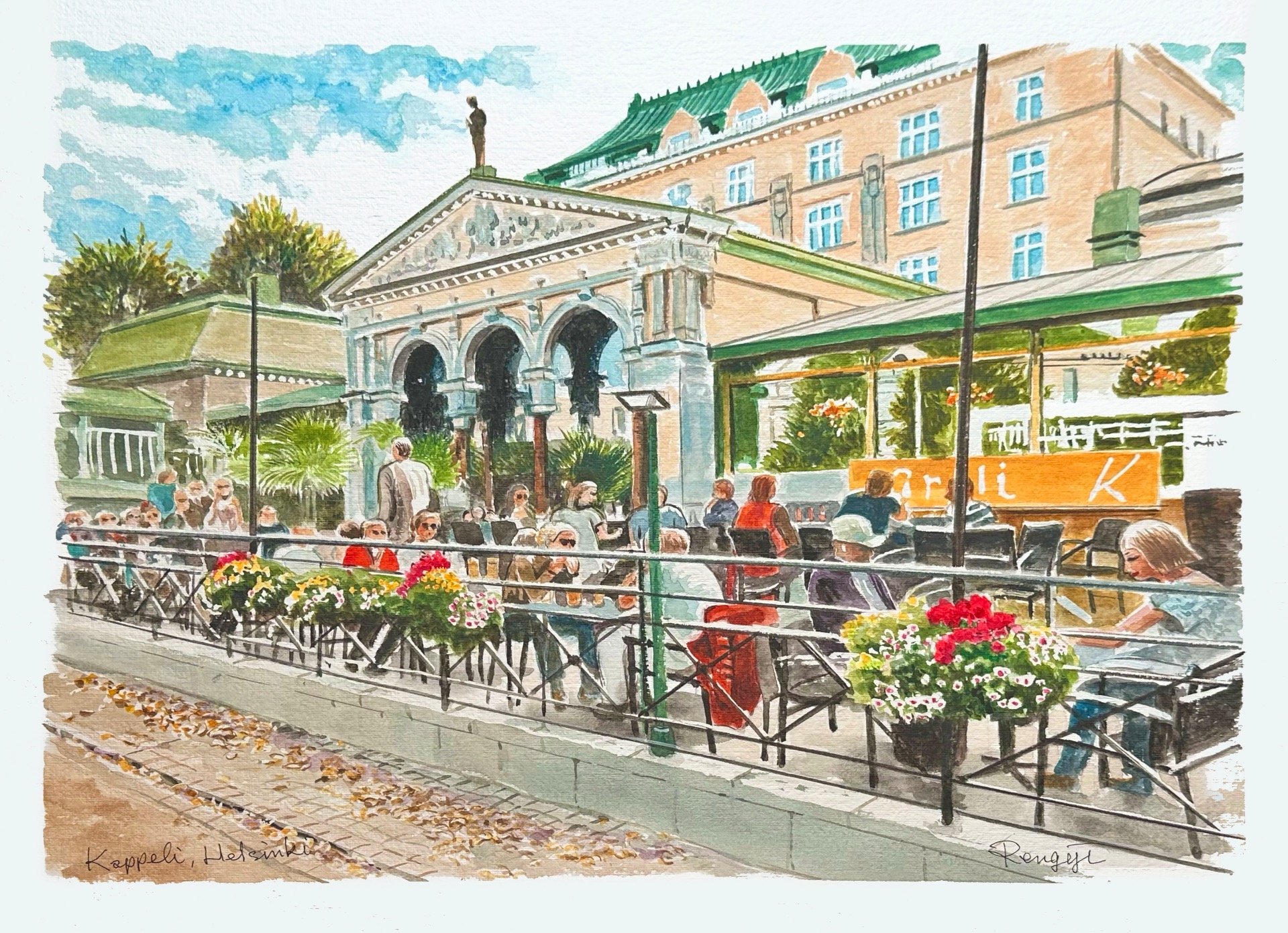 ヘルシンキの銀座通り、エスプラナディにある「Kappeli」チャペルの高級レストラン  F6号 水彩画