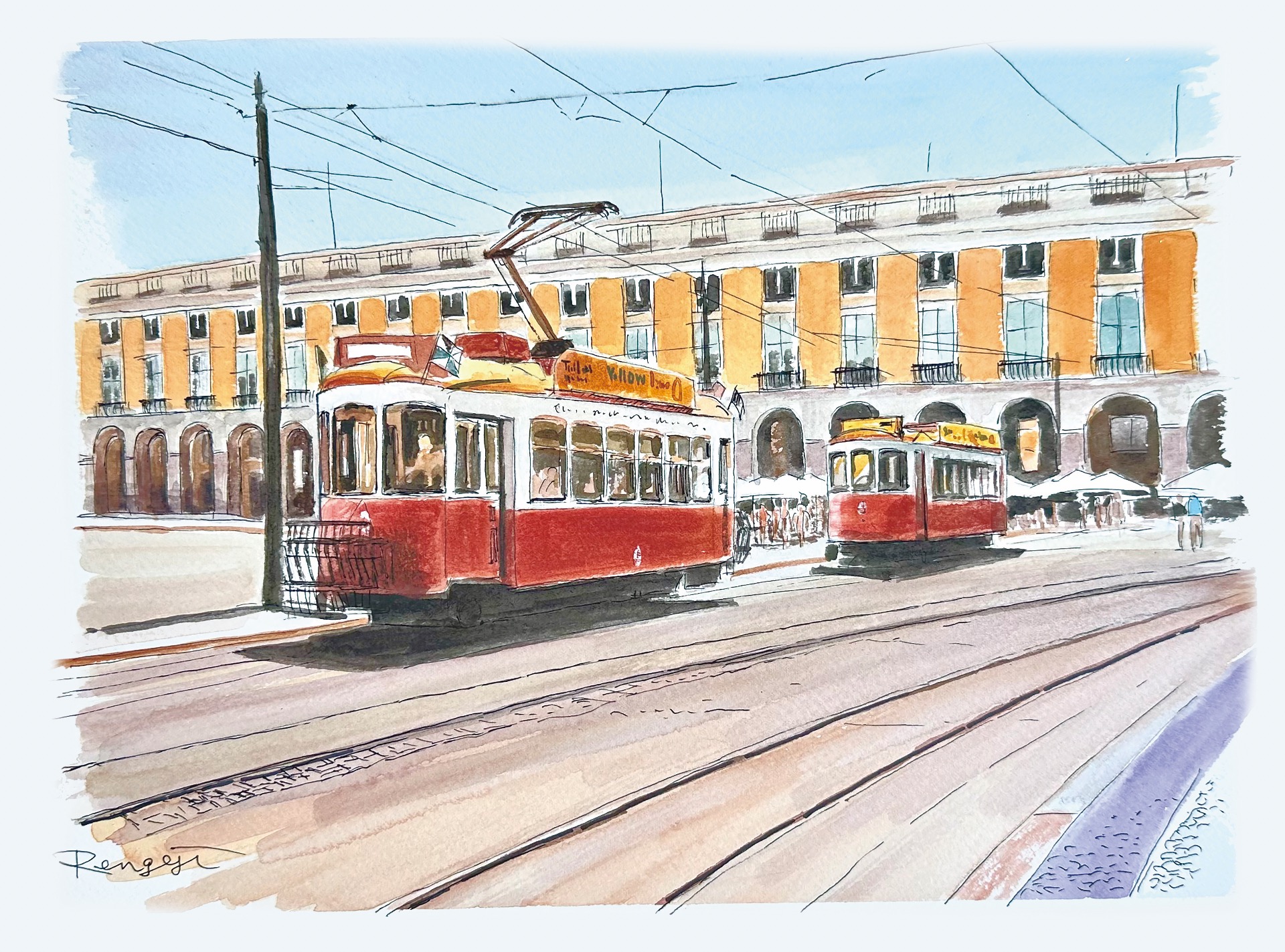 坂の街リスボンの、数少ない平坦なコメルシオ広場。 F4号 水彩画
