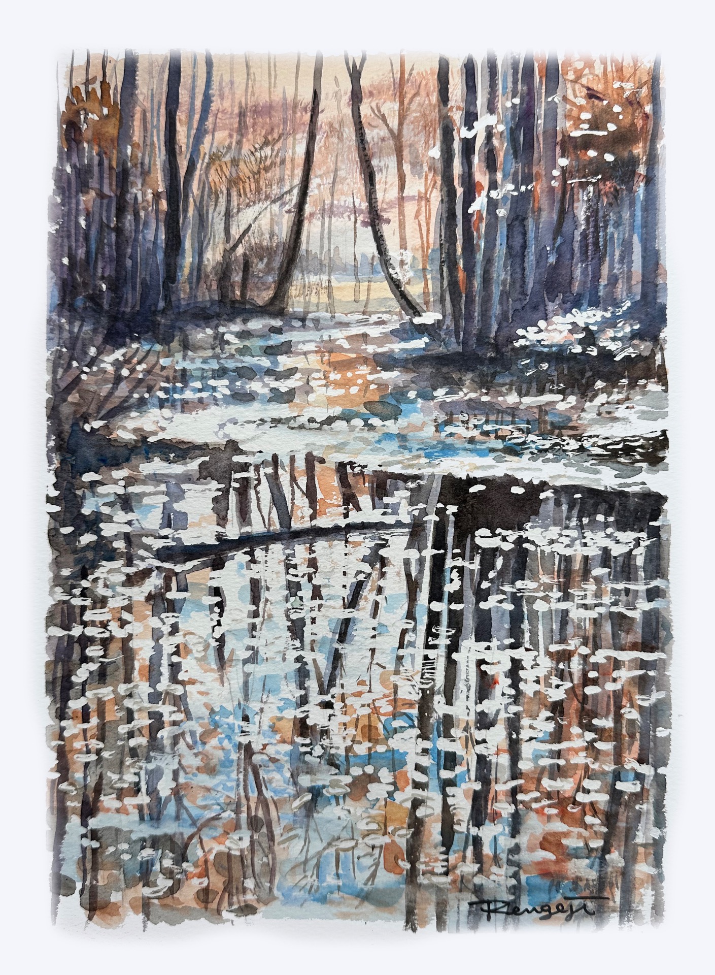 森の中を散歩すると鹿やウサギと遭遇する。水面に映る景色が美しい。 F4号 水彩画